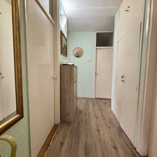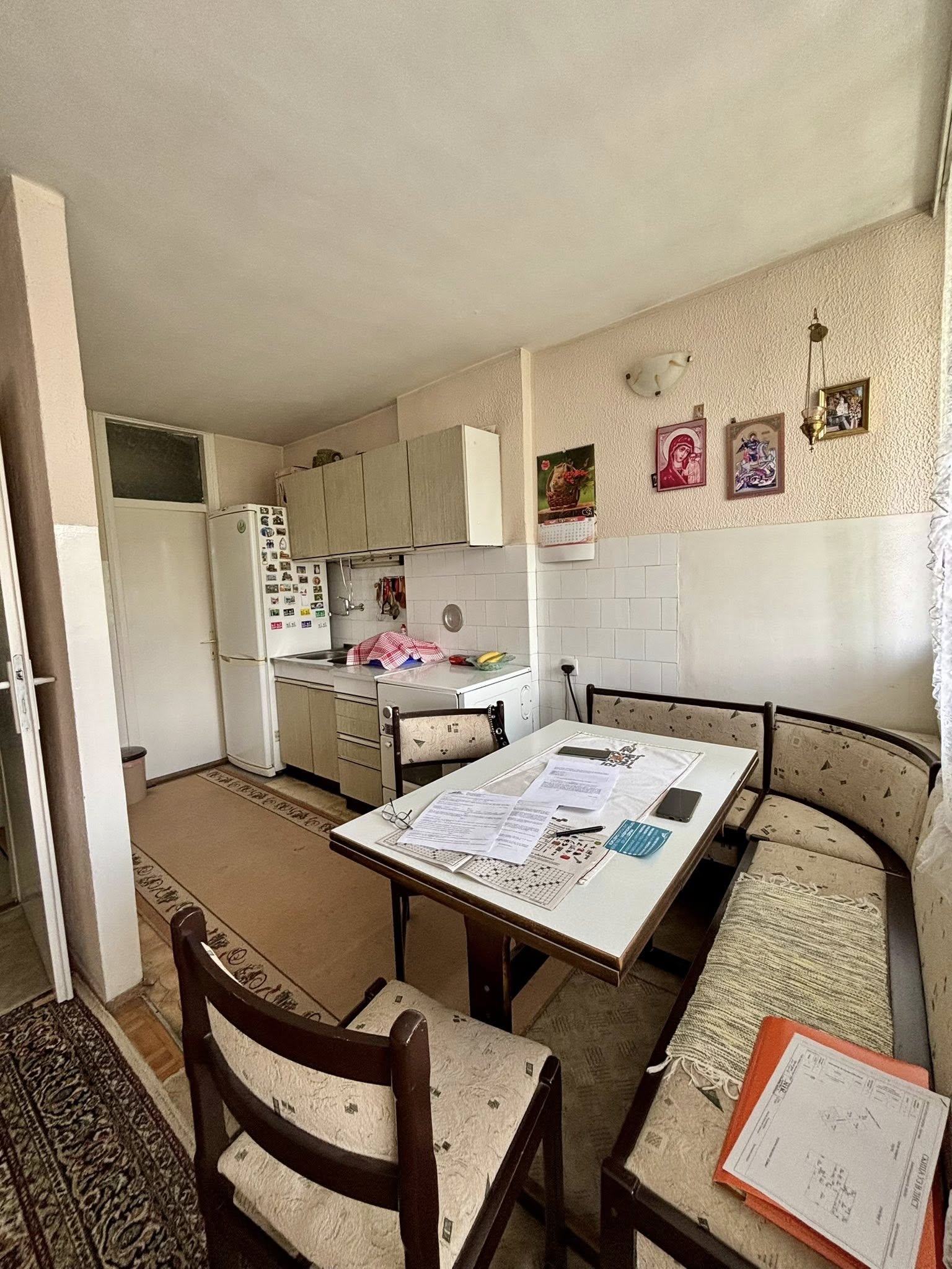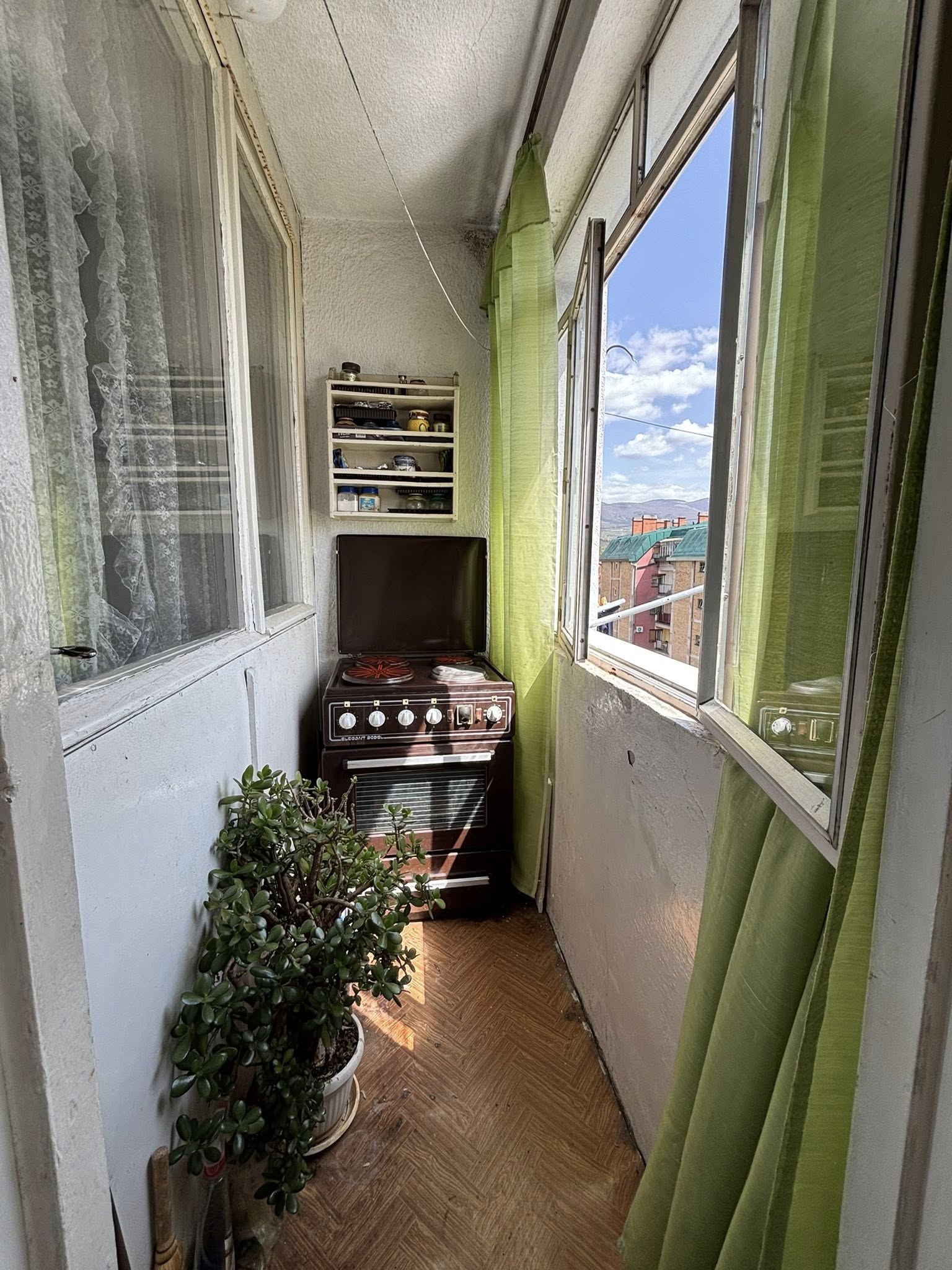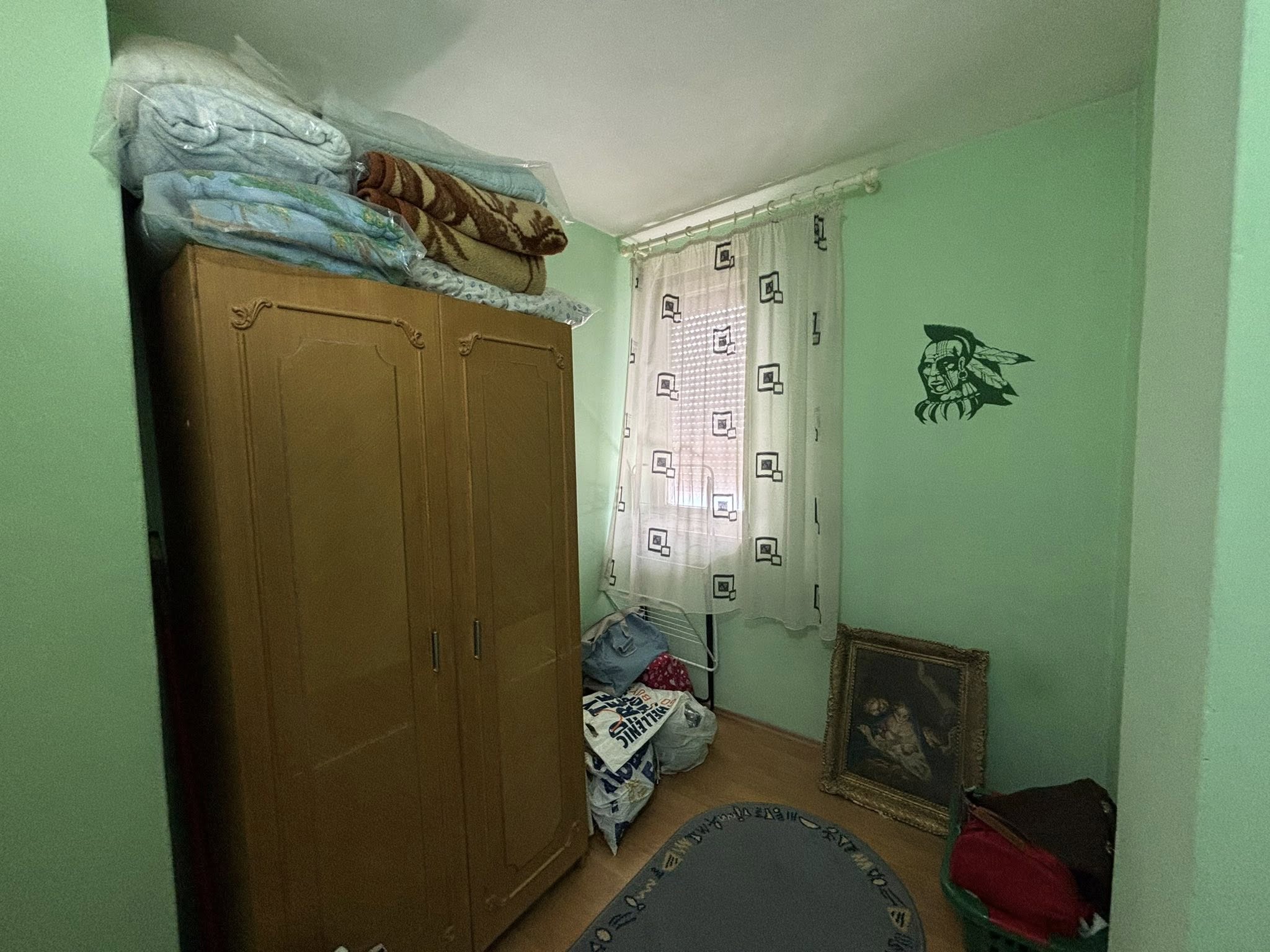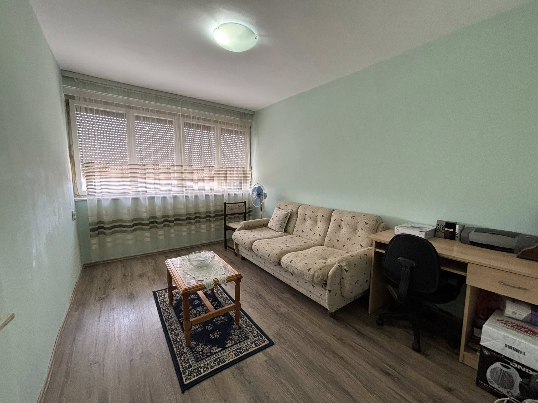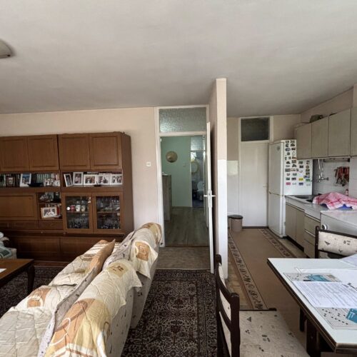 Stan se nalazi na 4. spratu (bez lifta) i sastoji se od hodnika, dnevne sobe sa kuhinjom i trpezarijom (izlaz na zastakljenu terasu), spavaće sobe, dečije sobe i kupatila.