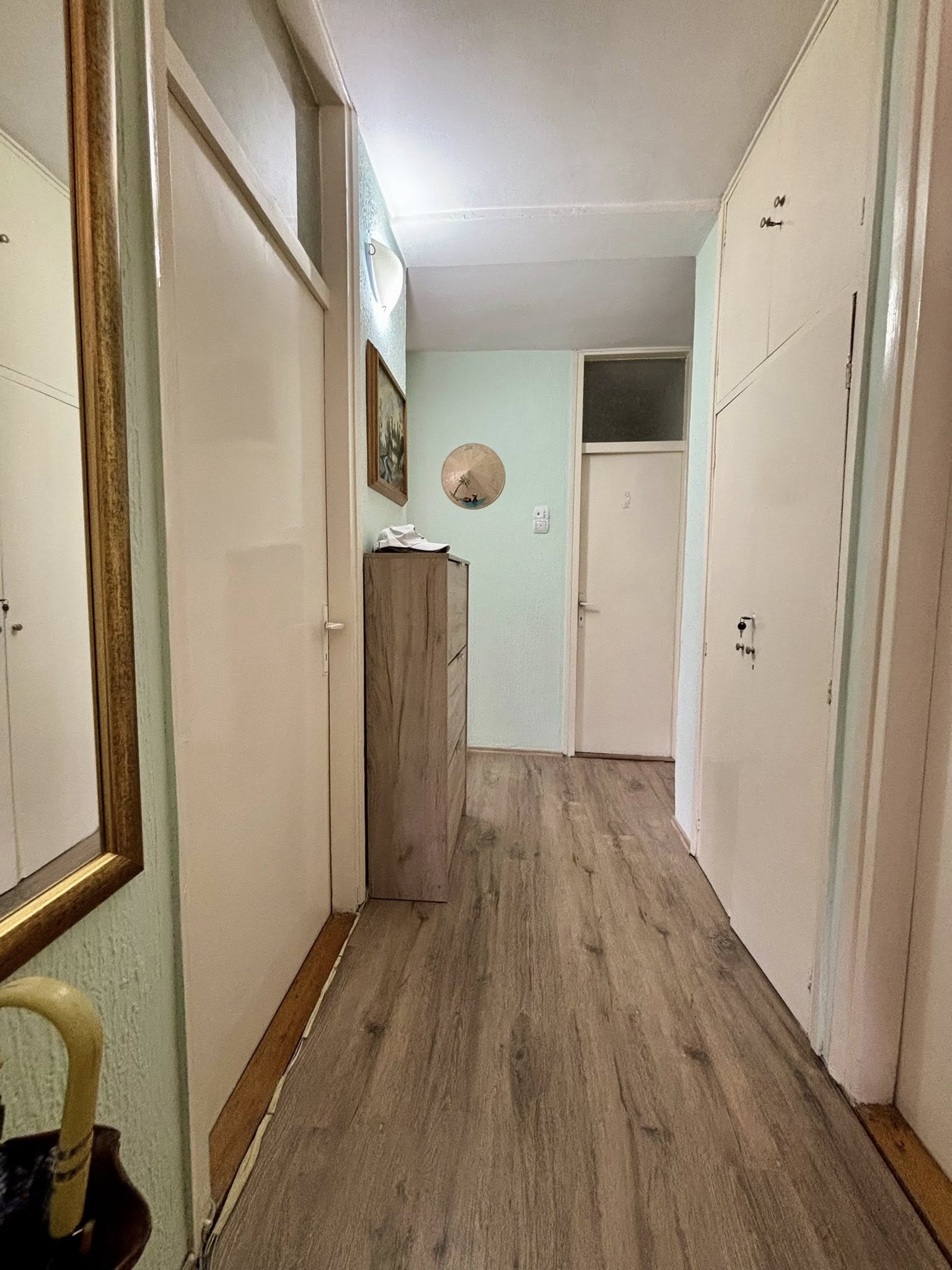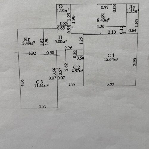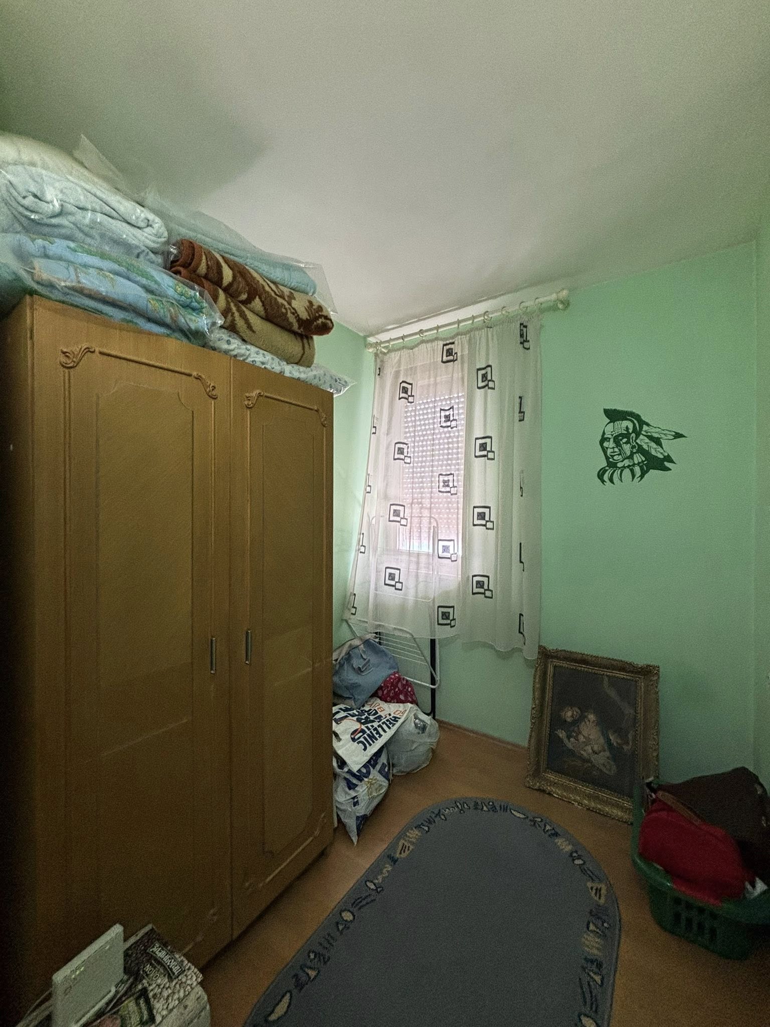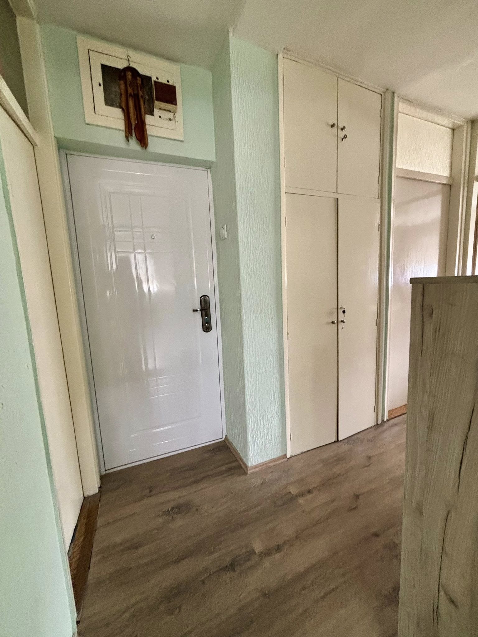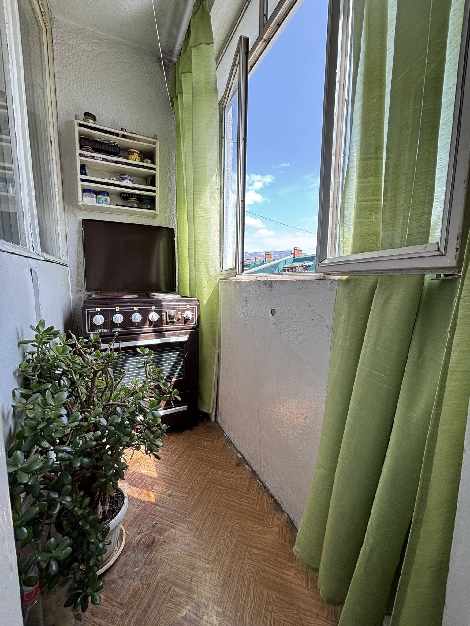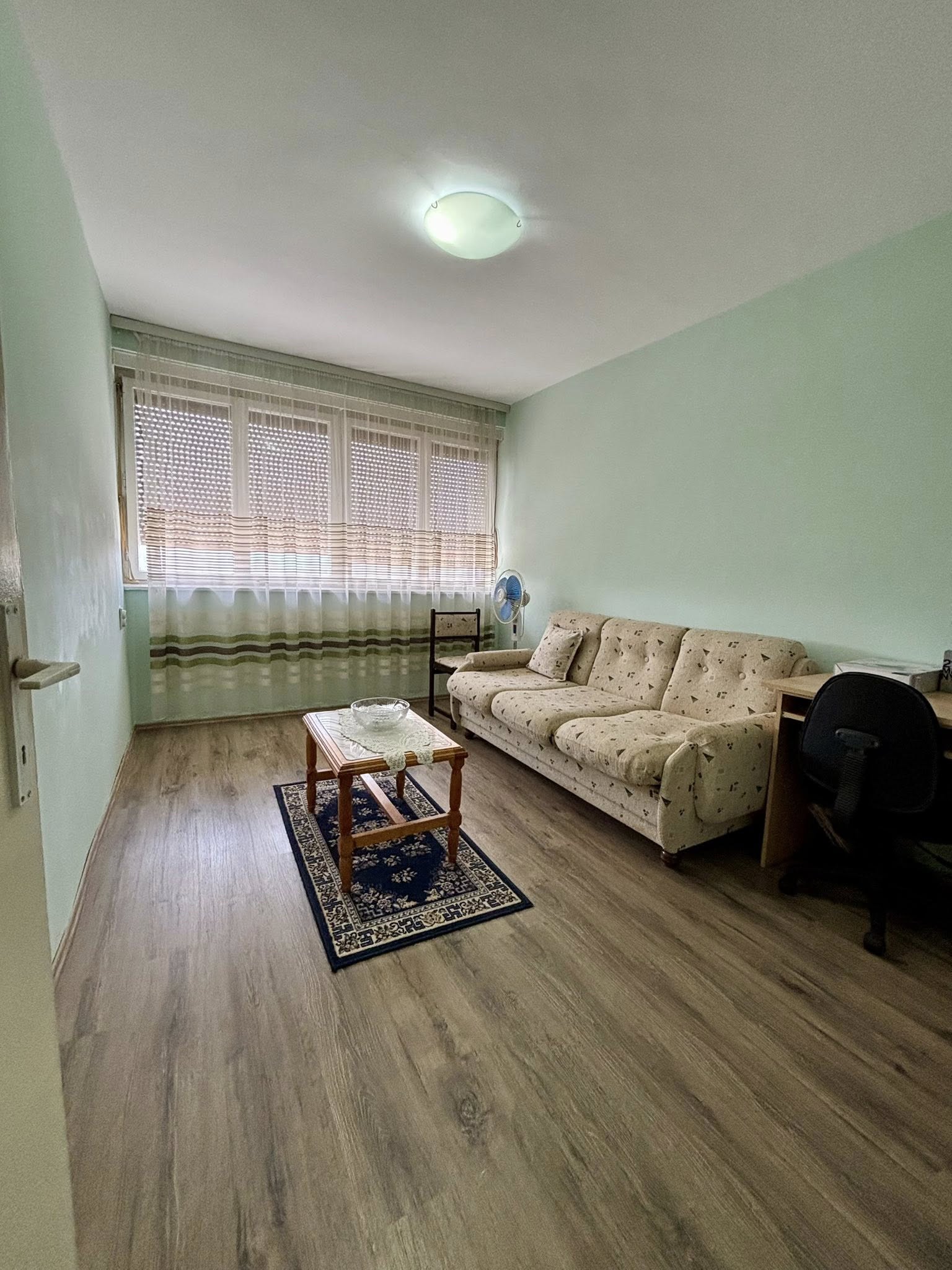 Stan se nalazi na 4. spratu (bez lifta) i sastoji se od hodnika, dnevne sobe sa kuhinjom i trpezarijom (izlaz na zastakljenu terasu), spavaće sobe, dečije sobe i kupatila.